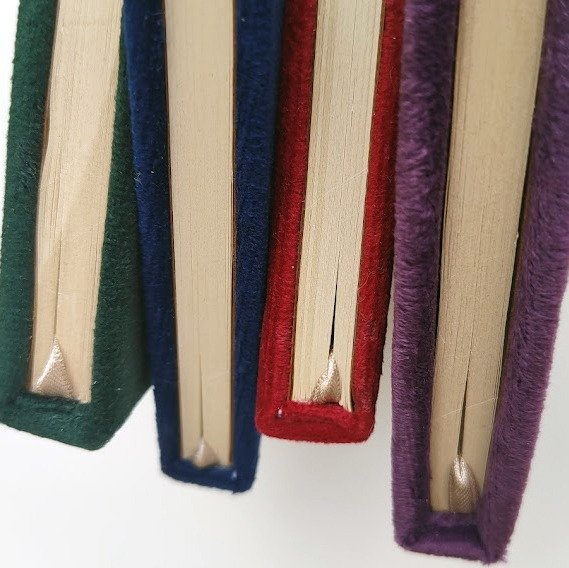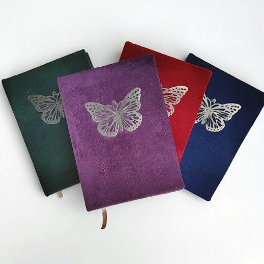 Diseño de Portada: Las tapas están forradas con tela de pana y un aplique en forma de Mariposa en metal.