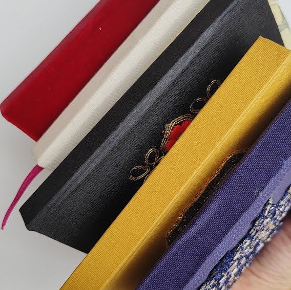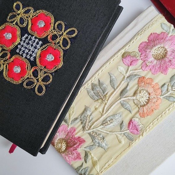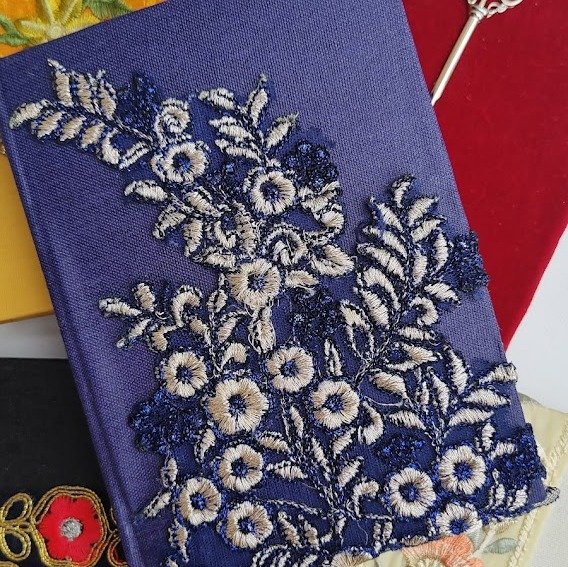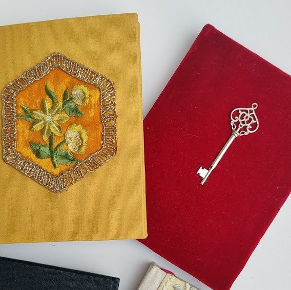 Diseño de Portada: Las tapas están forradas con tela y apliques en tela o metal.